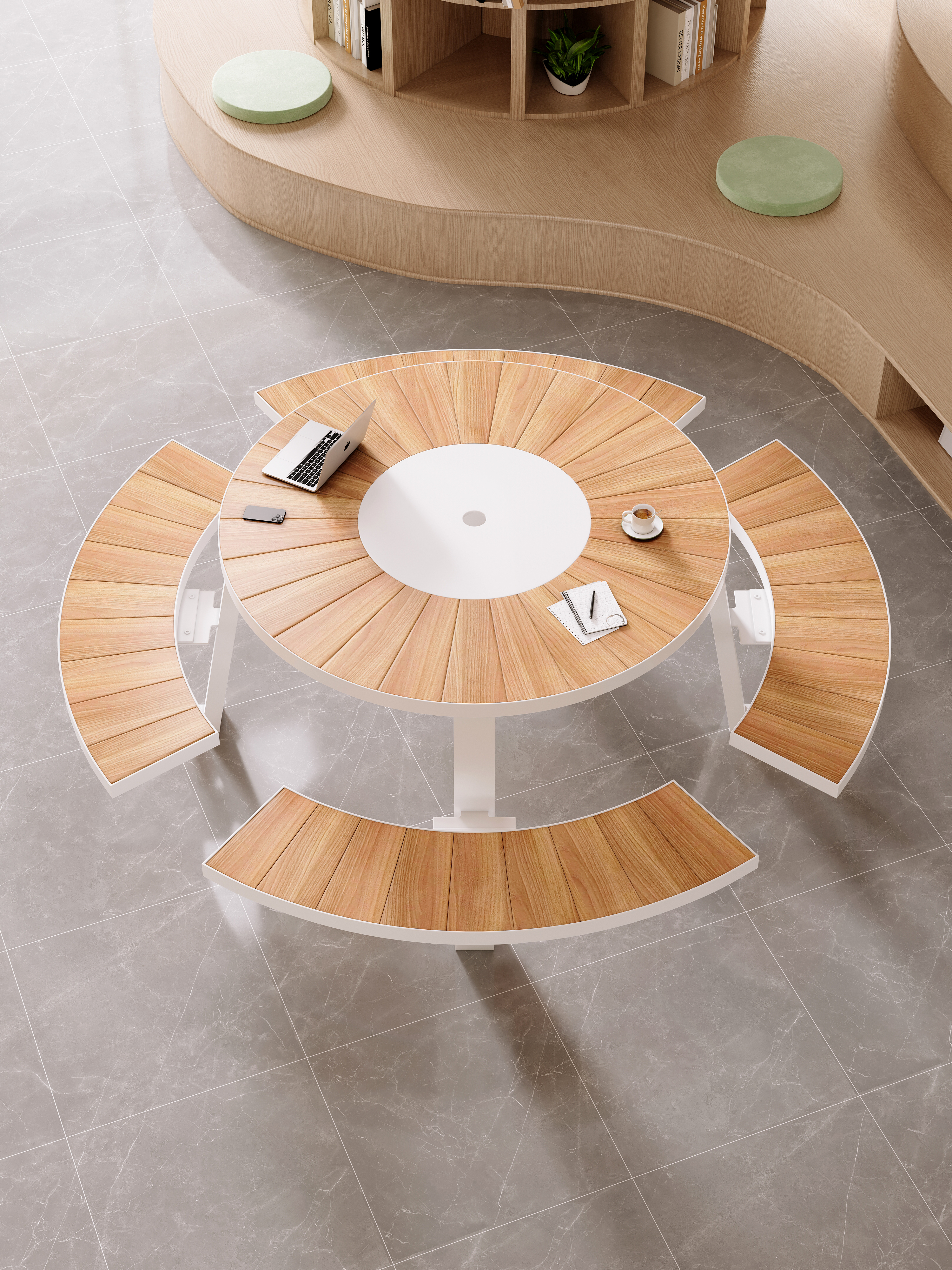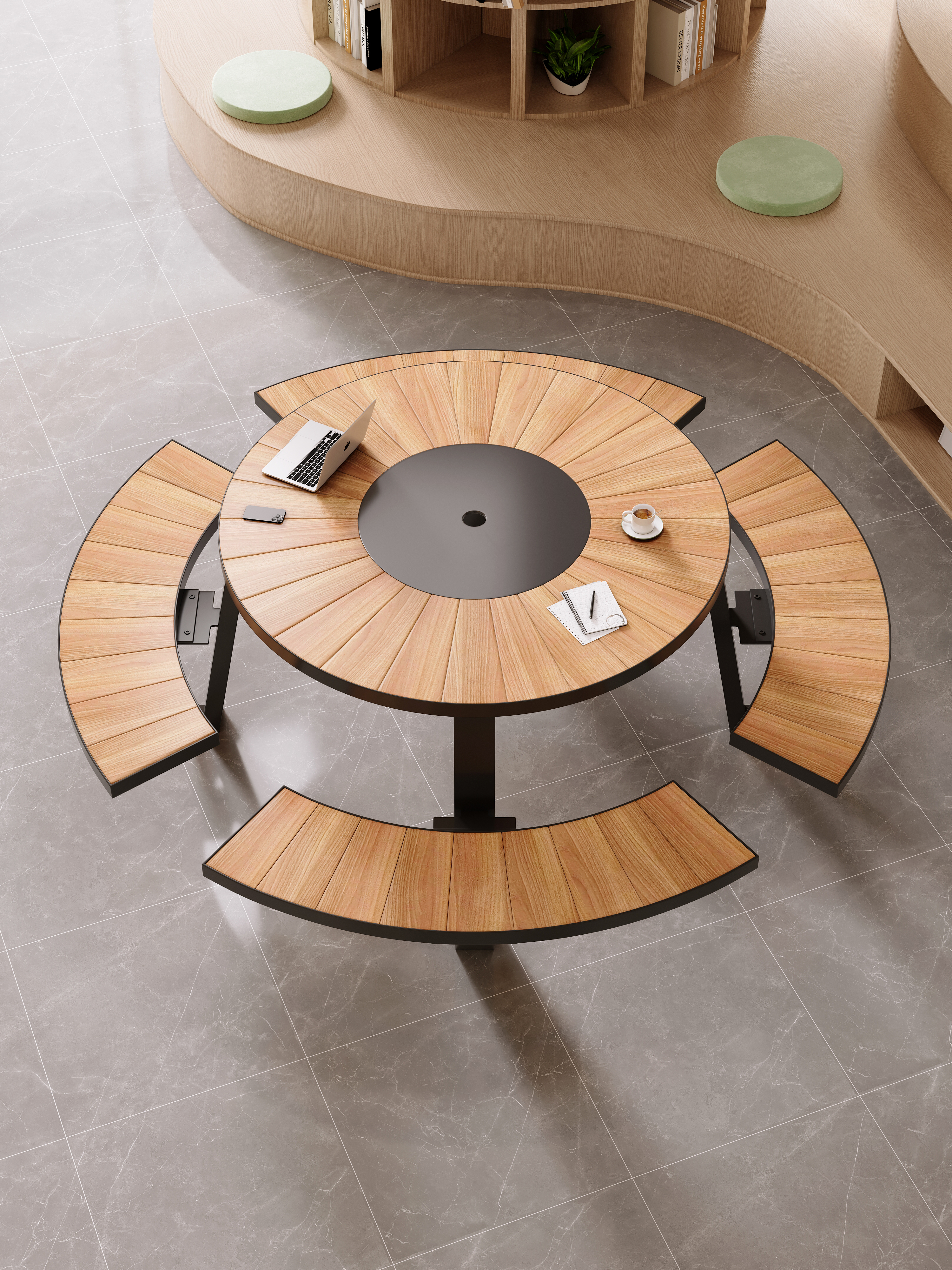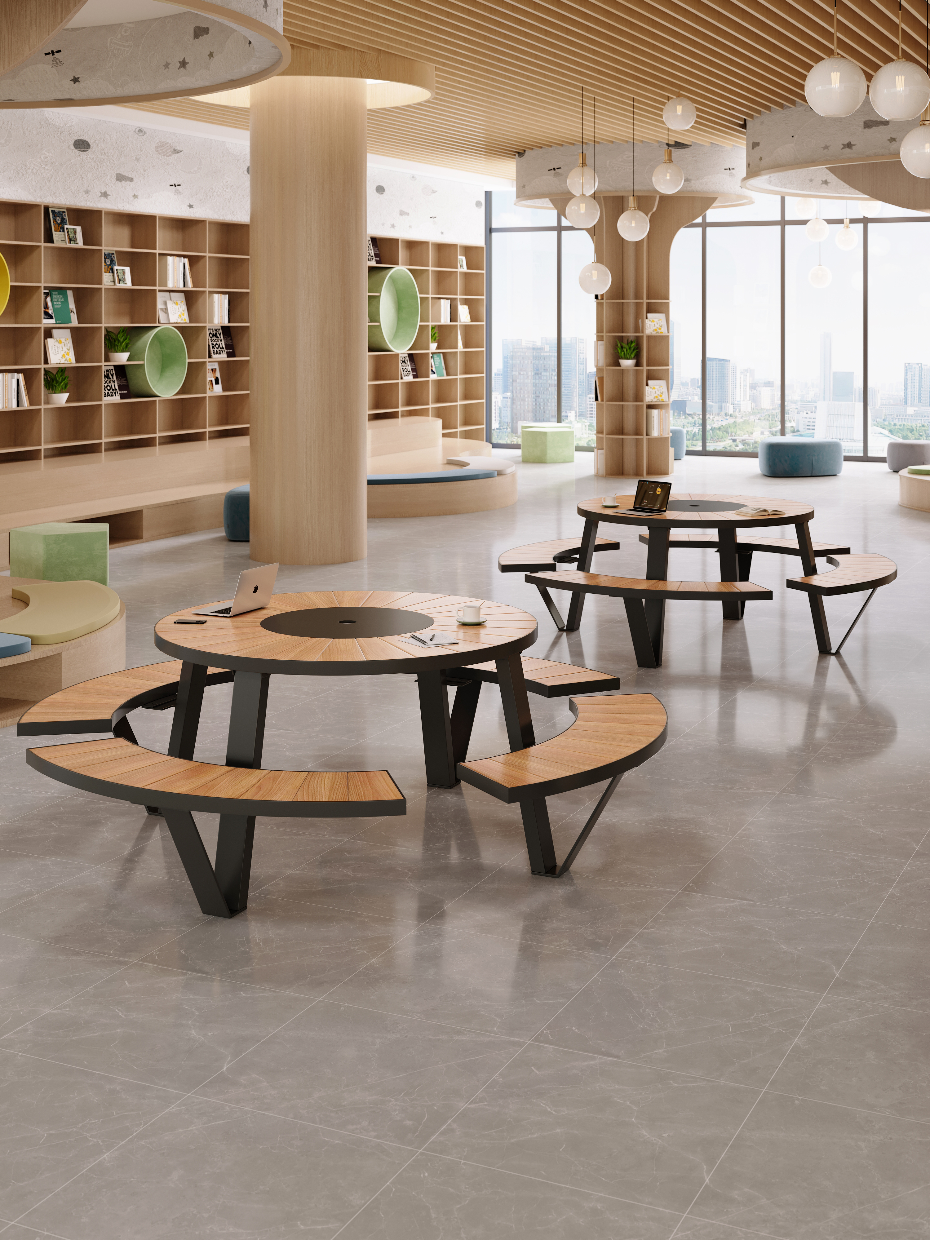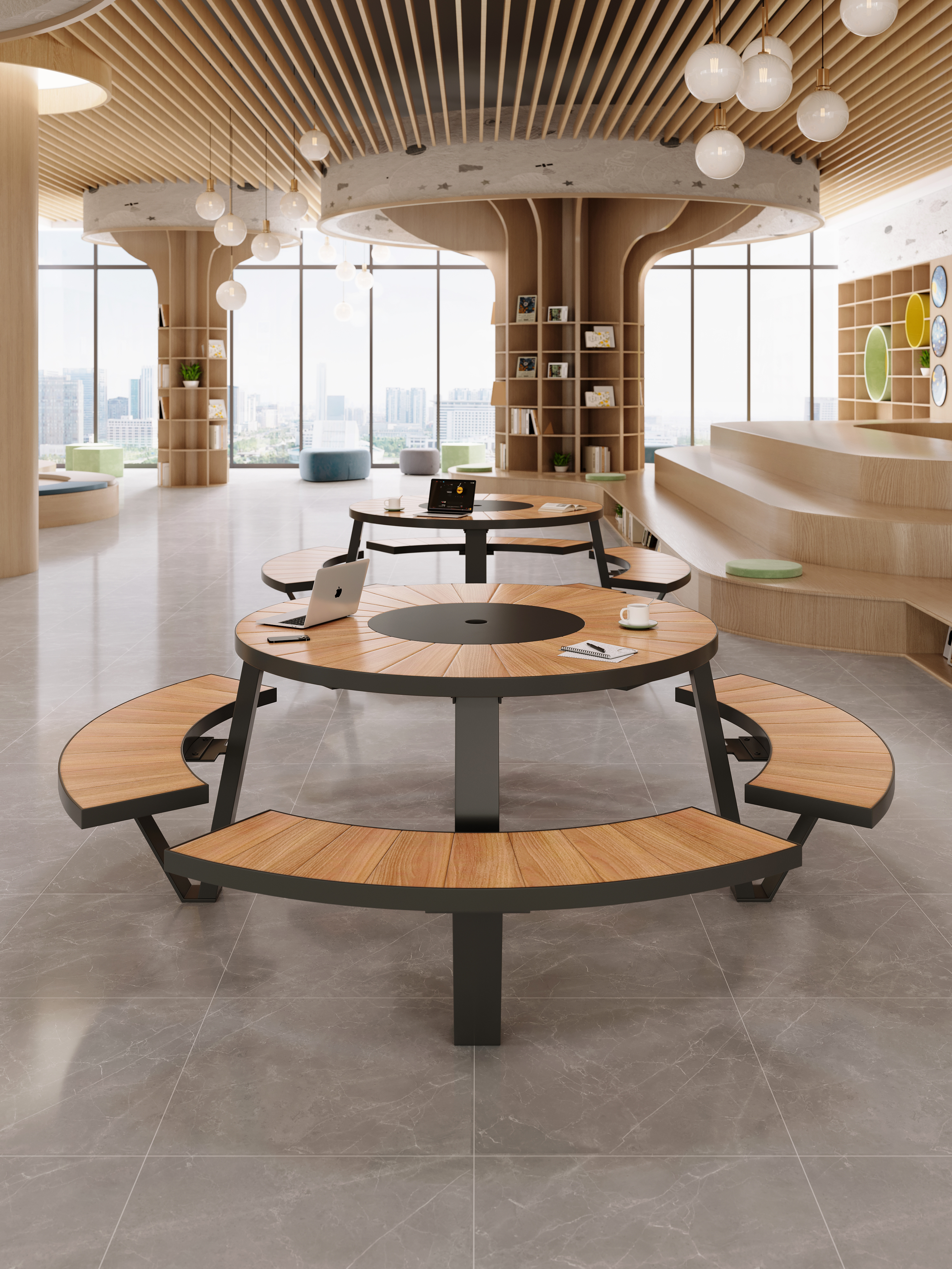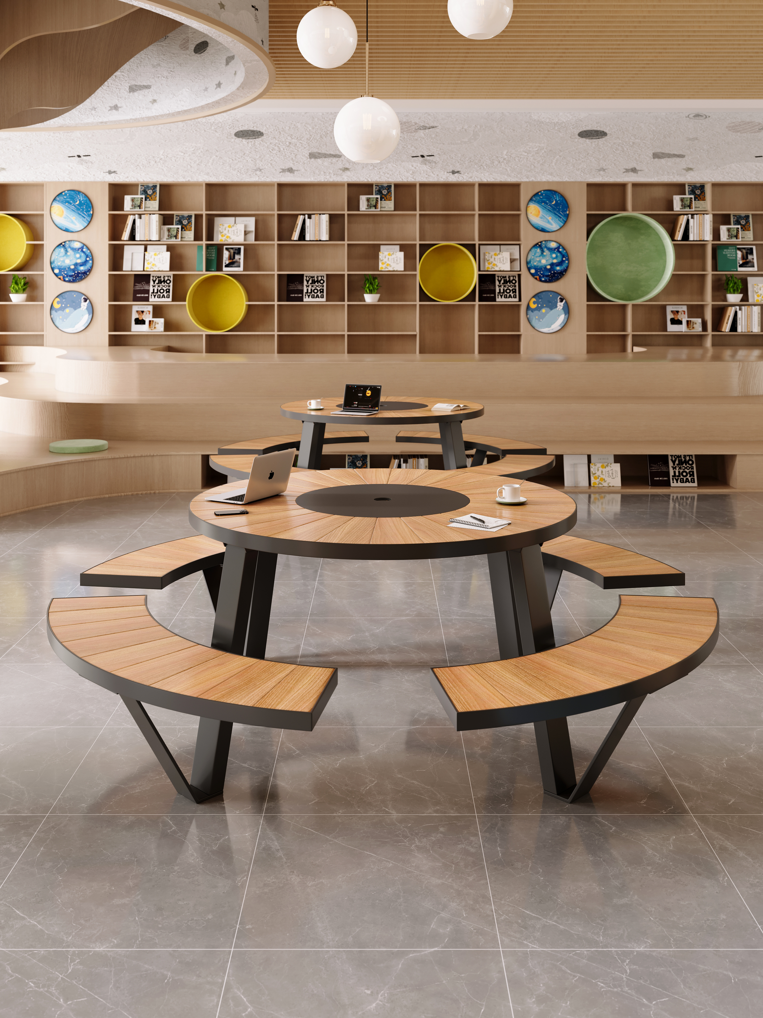 Ideal for libraries, homes, entryways, shopping malls, cafés, and restaurants, this library table round design provides ample seating space while maintaining a sleek, modern aesthetic. Whether used for reading, studying, meetings, or casual gatherings, this library table and chairs set offers a sophisticated touch to any setting.
